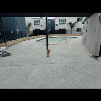 Concrete resurfacing gets rid of unwanted cracks in the concrete and leaves your concrete looking brand new. Here is a job we did at a commercial property on the pool deck. We can resurface concrete anywhere where there is concrete. We can give old warn out concrete a texturized finish ranging from a stone pattern to a knockdown finish and then finishing with a paint color of your choosing. We also use a special kind of paint that is pool chemical resistant. On this particular job we also redid the pool. We went through a series of steps to paint the pool using an epoxy resin made for pools. Pool epoxy paint saves your plaster, so you don't have to replaster every 10 years, and it is much cheaper and nicer looking. The epoxy paint shines and reflects much better than plaster.